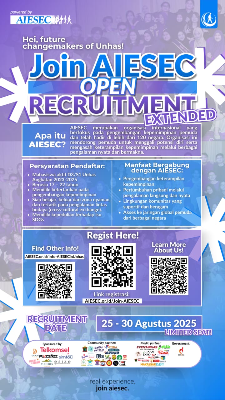 AIESEC in Universitas Hasanuddin (Unhas) membuka perpanjangan pendaftaran anggota baru. Pendaftaran ini resmi dibuka dari Minggu-Sabtu, (10-23/08) dan perpanjangan pendaftaran mulai Senin-Sabtu (25-30/08).
