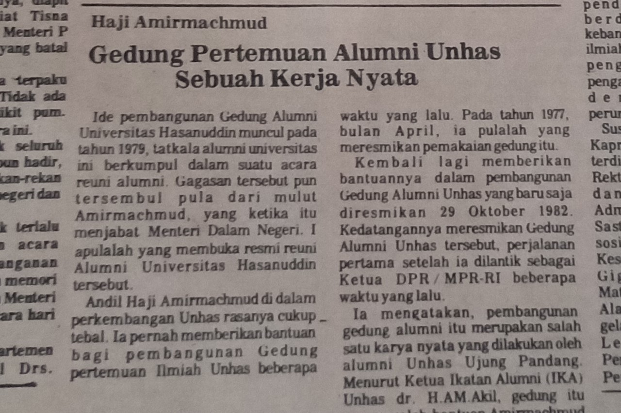 Membuka lembaran berita identitas Unhas edisi 8 November 1982, ide pembangunan Gedung Pertemuan Alumni (GPA) muncul pada 1979 tatkala para alumni Unhas berkumpul dalam suatu reuni. Gagasan tersebut tersembul dari mulut Amirmachmud yang pada masa itu sedang menjabat sebagai Menteri Dalam Negeri.