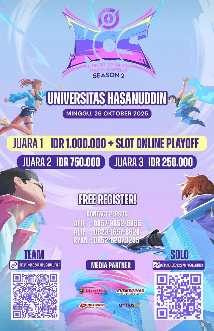 Honor of Kings (HOK) Kings Campus Series (KCS) Season 2 bersama Universitas Hasanuddin (Unhas) Esports adakan kompetisi HOK: Campus Attack. Perlombaan akan berlangsung di Auditorium Prof A Amiruddin Fakultas Kedokteran (FK) Unhas, Senin (26/10).