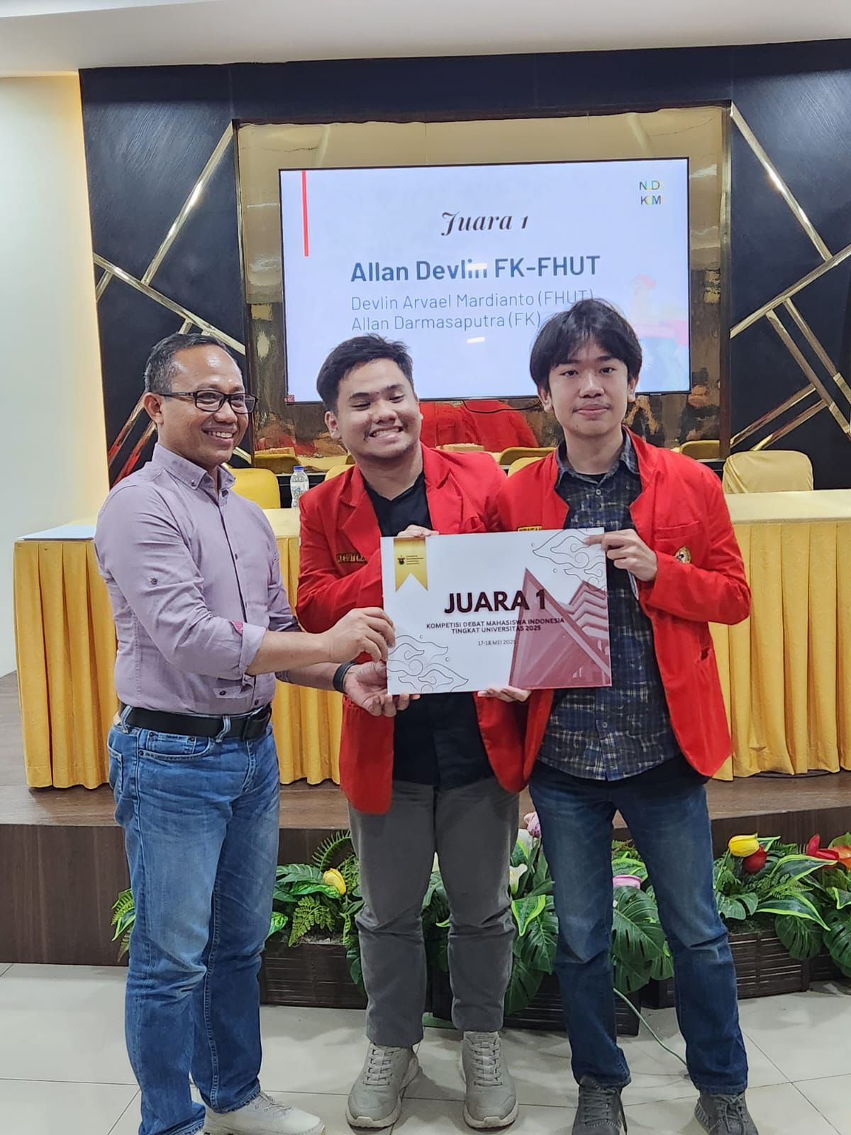 Mahasiswa Fakultas Kedokteran (FK), Allan Darma Saputra dan Fakultas Kehutanan (FKehut) Devlin Arvael Universitas Hasanuddin (Unhas) berhasil meraih Juara 1 dalam Kompetisi Debat Mahasiswa Indonesia (KDMI) tingkat universitas 2025, Selasa (18/5).
