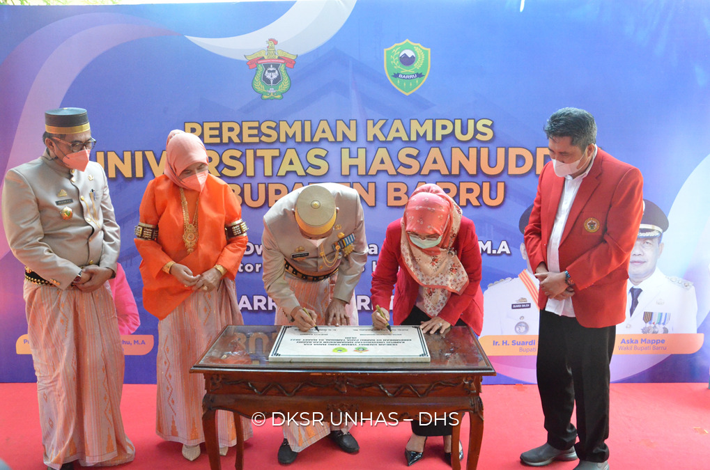 Rektor Unhas, Prof Dr Dwia Aries Tina Pulubuhu MA bersama Bupati Barru, Ir H Suardi Saleh MSi hadir langsung meresmikan kampus vokasi Unhas melalui penandatanganan prasasti.
