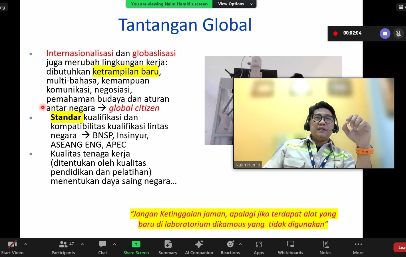 Pada kesempatannya, Naim memaparkan beberapa peluang dan tantangan yang akan dihadapi oleh lulusan Teknik Mesin di dunia kerja. Tantangan itu terdiri pada tingkat global dan dari dalam negeri.