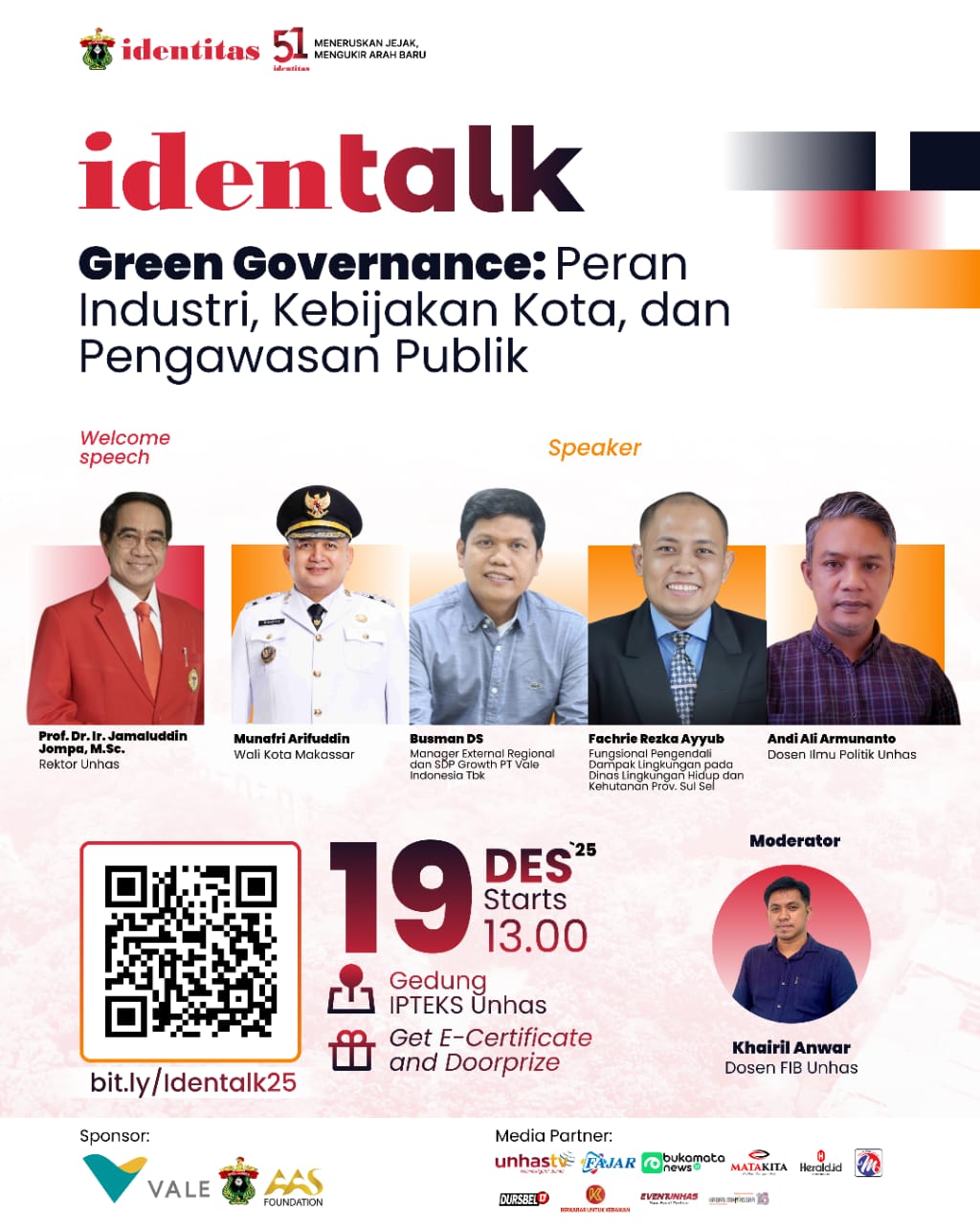 Penerbitan Kampus (PK) identitas Universitas Hasanuddin (Unhas) akan menggelar Identalk 2025 sebagai bagian dari rangkaian Dies Natalis ke-51. Kegiatan yang mengusung tema “Green Governance: Peran Industri, Kebijakan Kota, dan Pengawasan Publik” ini akan dilaksanakan di Lantai 2 Gedung Ipteks Unhas, Jumat (19/12).