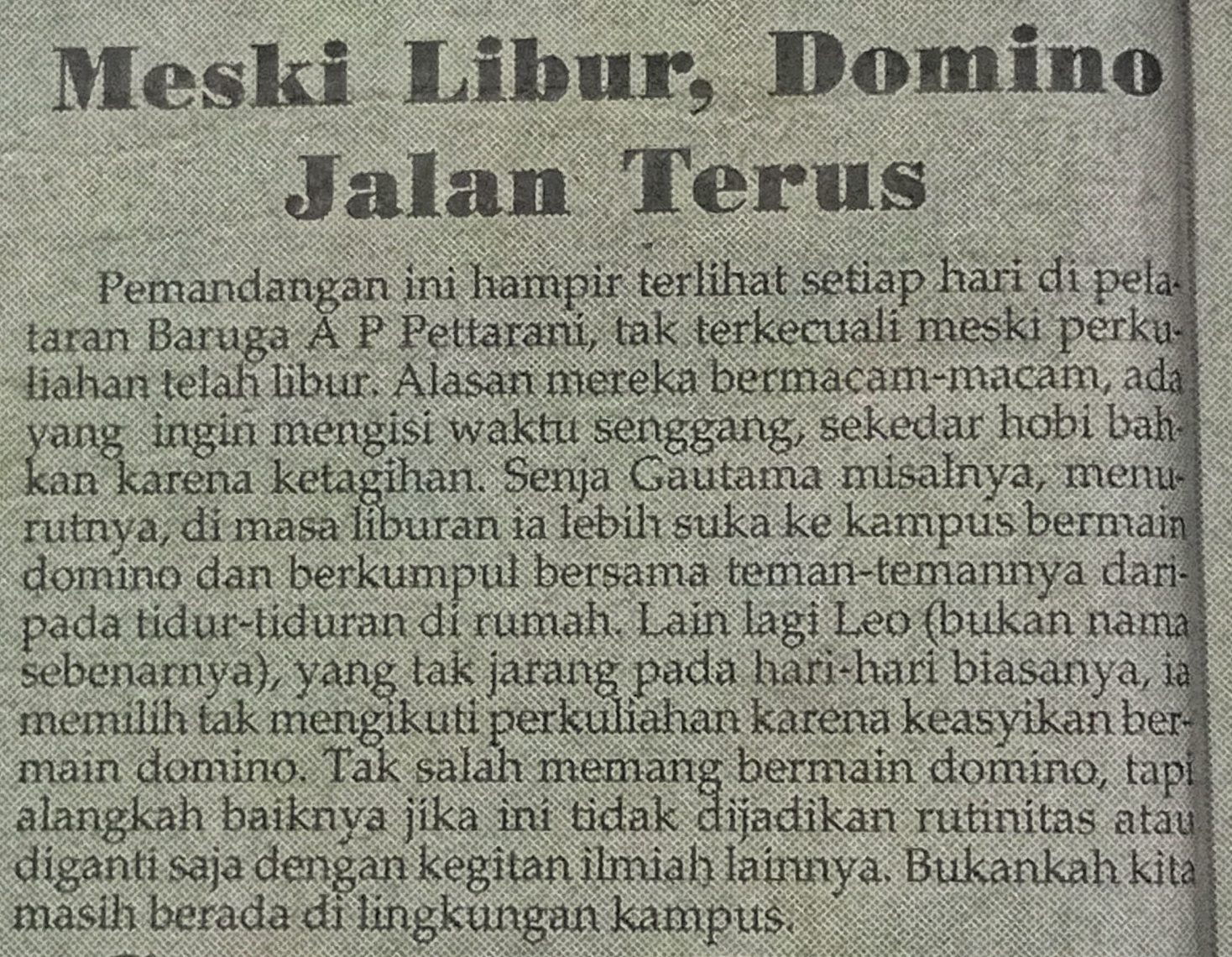 Di waktu yang berdekatan, identitas edisi awal Februari 2004 kembali menyoroti bagaimana permainan domino berubah menjadi ajang pertaruhan. Di bawah pohon rindang depan Pusat Kegiatan Mahasiswa (PKM), beberapa mahasiswa terlihat sangat serius memainkan domino dengan uang sebagai taruhannya.