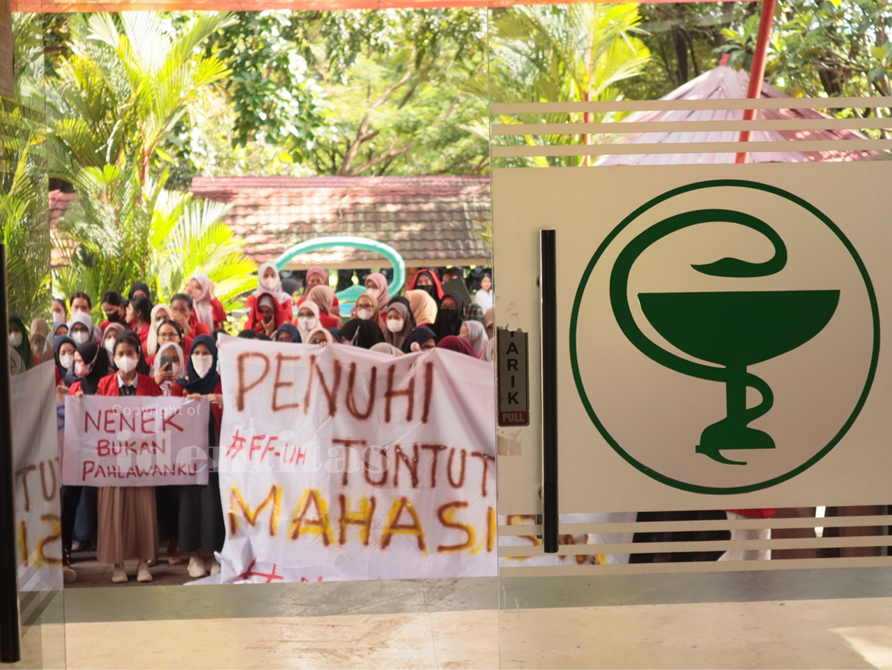 Sekitar pukul 14.30 Wita, ratusan mahasiswa Fakultas Farmasi (FF) Unhas berunjuk rasa di depan Dekanat Fakultas Farmasi, Jumat (28/02). Unjuk rasa ini dipicu oleh kondisi akademik di tingkat fakultas yang tidak stabil.