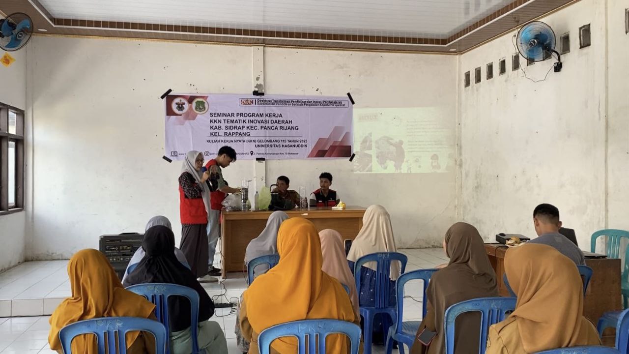 Mahasiswa Kuliah Kerja Nyata Tematik (KKN-T) Gelombang 115 Universitas Hasanuddin (Unhas) mengadakan sosialisasi pengelolaan sampah berbasis konsep Reduce, Reuse, Recycle (3R). Kegiatan ini dilaksanakan di Aula Kelurahan Rappang, Kecamatan Panca Rijang, Kabupaten Sidenreng Rappang (Sidrap), Selasa (06/01).