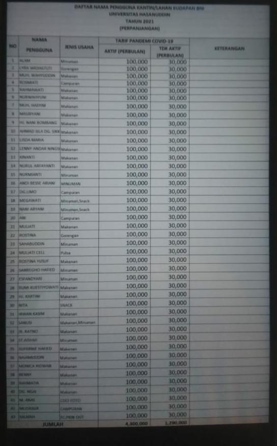 Dalam pesan itu terdapat tabel rincian perpanjangan sewa kantin di masa pandemi Covid-19. Bagi yang aktif menjual dikenakan Rp 100.000 sedangkan yang tidak aktif Rp 30.000.