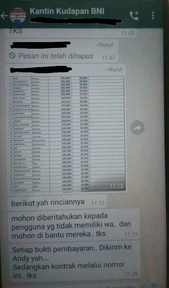 “Berikut yah rinciannya. Mohon diberi tahu kepada yang tidak memiliki WA,” kata Nurul, Staf Direktorat Inovasi dan Kewirausahaan Unhas dalam grup WhatsApp Kantin Kudapan BNI, pukul 11.13, Kamis (11/2).