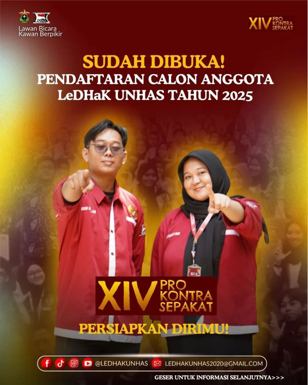 Lembaga Dialektika Haluan Kebangsaan (LeDHaK) Universitas Hasanuddin (Unhas) resmi membuka open recruitment (Oprec) melalui Proses Rekrutmen dan Orientasi (PRO) XIV bagi mahasiswa angkatan 2024 dan 2025. Pendaftaran berlangsung sejak Sabtu (23/08) hingga Senin (08/09).