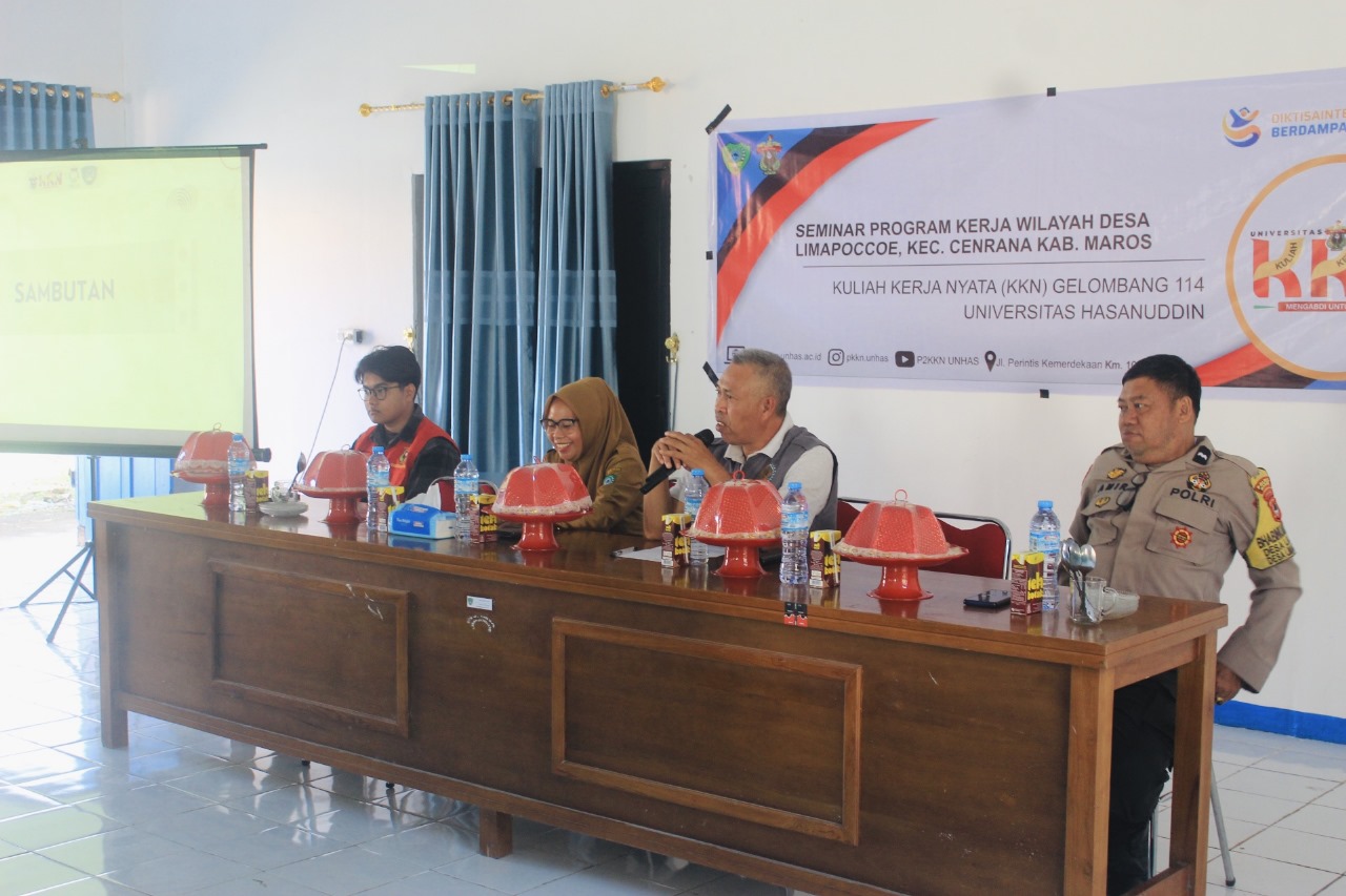 Mahasiswa Kuliah Kerja Nyata (KKN) Universitas Hasanuddin (Unhas) mengadakan Seminar Program Kerja di Aula Kantor Desa Limapoccoe, Kecamatan Cenrana, Kabupaten Maros, Senin (21/07).
