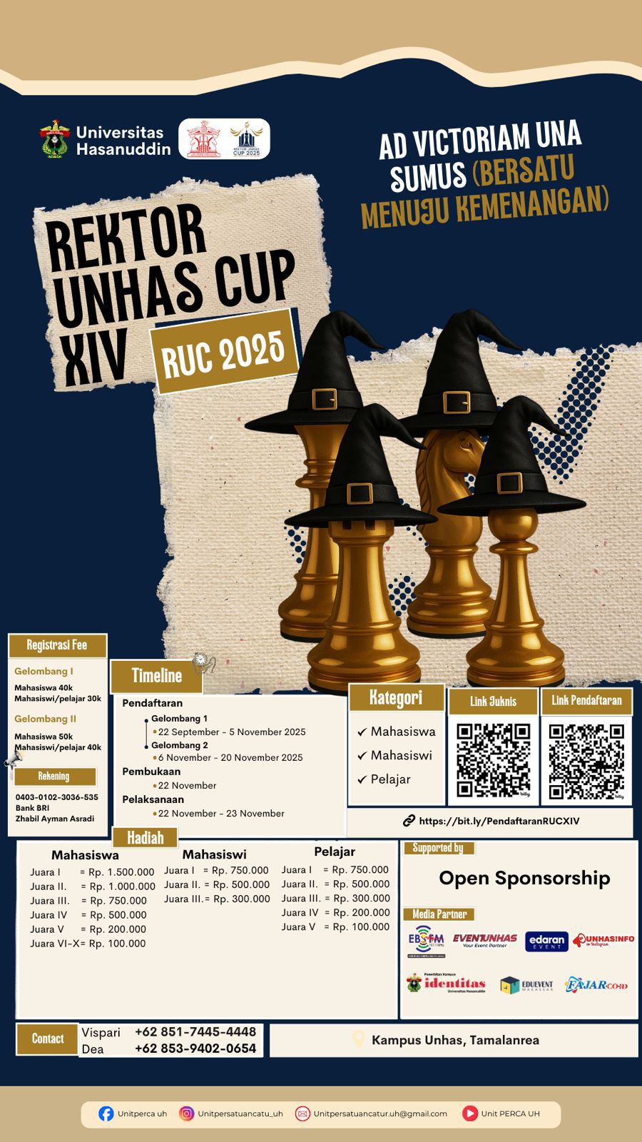 Unit Persatuan Catur (PERCA) Universitas Hasanuddin (Unhas) akan menggelar Kejuaraan Nasional Rektor Unhas Cup (RUC) XIV tahun 2025 dengan tema “Ad Victoriam Una Sumus (Bersatu Menuju Kemenangan)”. Kegiatan ini dijadwalkan berlangsung di Kampus Unhas, Tamalanrea, pada Rabu–Kamis (22–23/11).