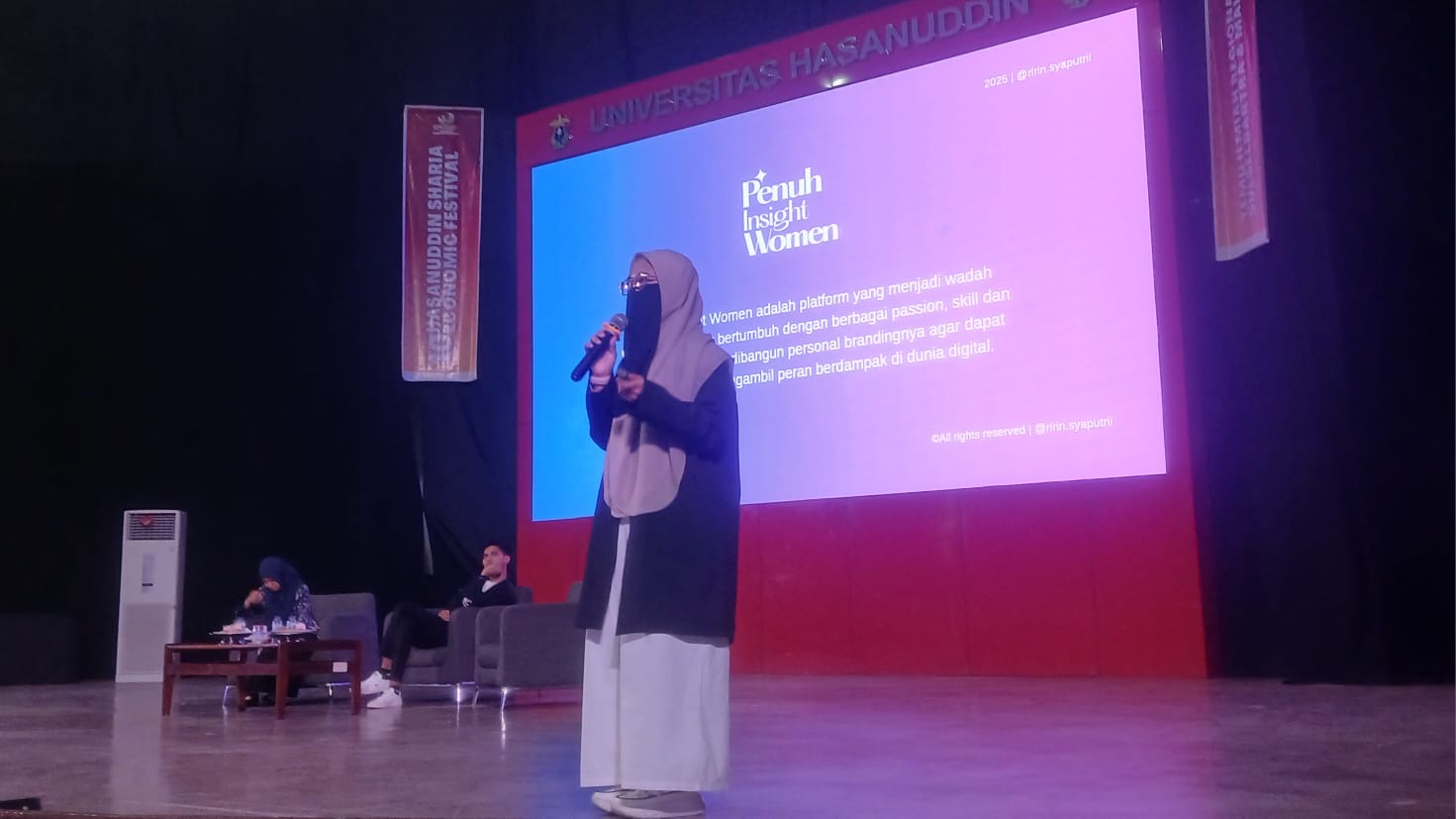 Content Creator sekaligus Founder Penuh Insight Women, Ririn Syaputri hadir sebagai pembicara dalam Seminar Sharia Economic x Digital Era Kelompok Studi Ekonomi Islam Forum Studi Ekonomi Islam (KSEI FoSEI) Universitas Hasanuddin (Unhas). Kegiatan ini berlangsung di Baruga Andi Pangerang Pettarani Unhas, Jumat (18/07).