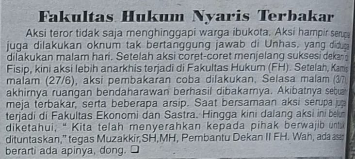 Pada 2002, identitas mencatat, FH nyaris terbakar akibat ulah oknum tak bertanggung jawab. Api sempat melalap ruang bendahara, menghanguskan meja dan beberapa dokumen.