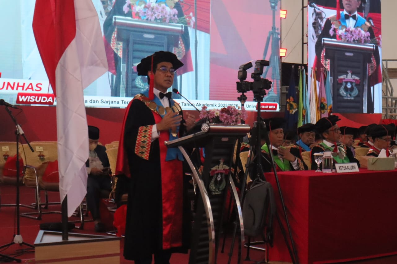 Rektor Universitas Hasanuddin (Unhas), Prof Dr Ir Jamaluddin Jompa MSc, mengangkat isu Pemilihan Rektor (Pilrek) dalam sambutan pembuka Wisuda Periode Oktober Tahun Akademik 2025/2026. Wisuda ini berlangsung di Gelanggang Olahraga (GOR) JK Arenatorium, Selasa (28/10).