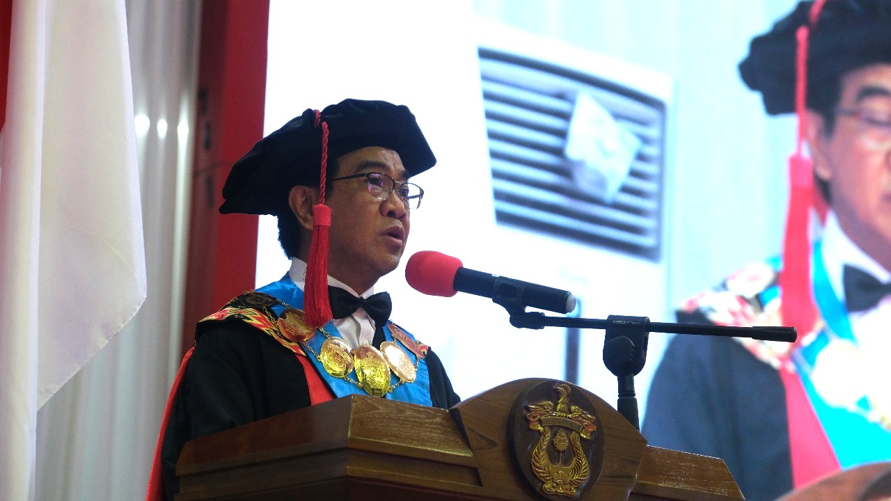 Rektor Universitas Hasanuddin (Unhas), Prof Dr Ir Jamaluddin Jompa MSc hadir memberi sambutan dalam Wisuda Periode Desember Tahun Akademik 2025/2026. Agenda ini berlangsung di Baruga Andi Pangerang Pettarani, Rabu (17/12).