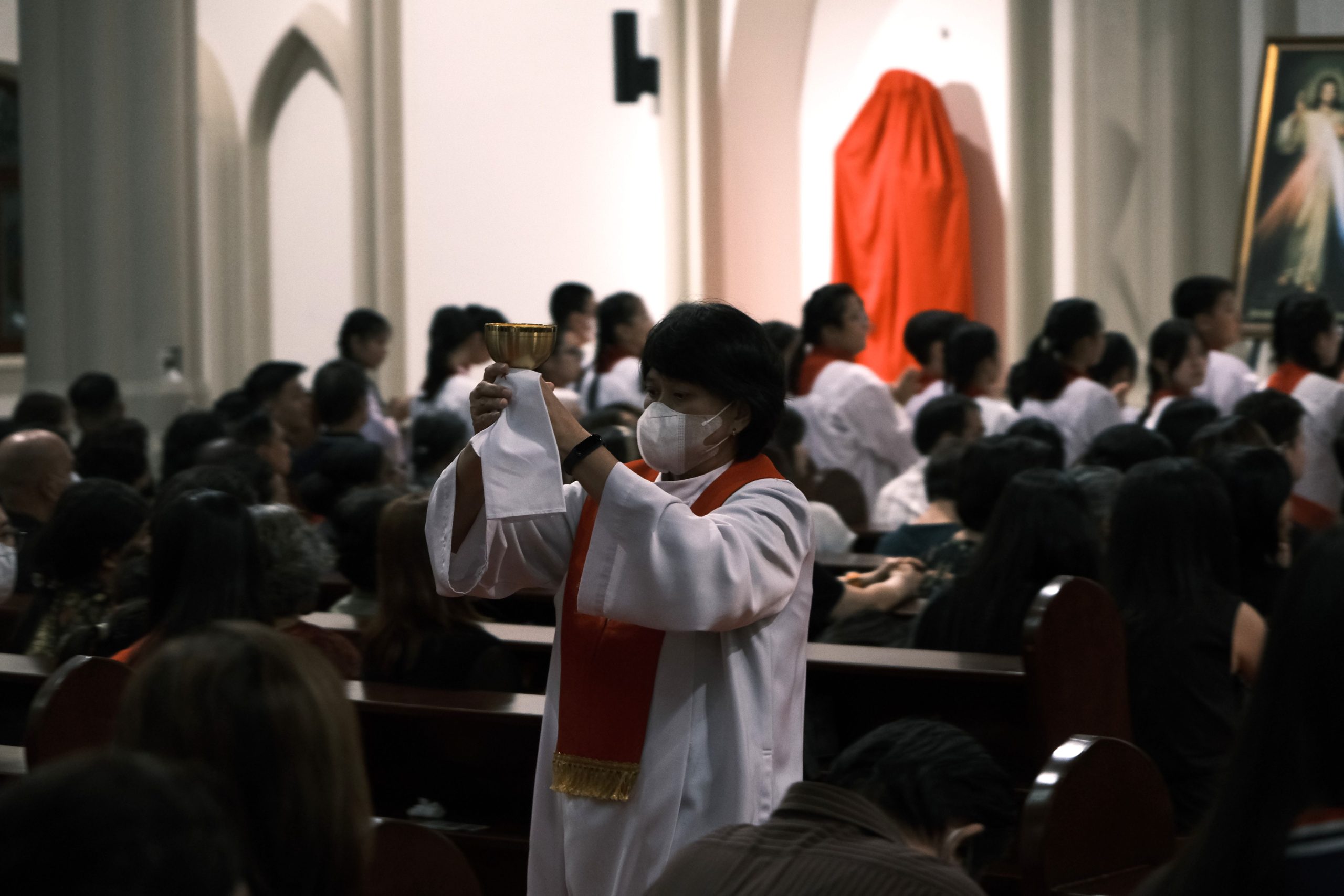 Prodiakon—penerima tugas suci dari Uskup—tampak berjalan perlahan, membagikan hosti kepada mereka yang telah dibaptis.