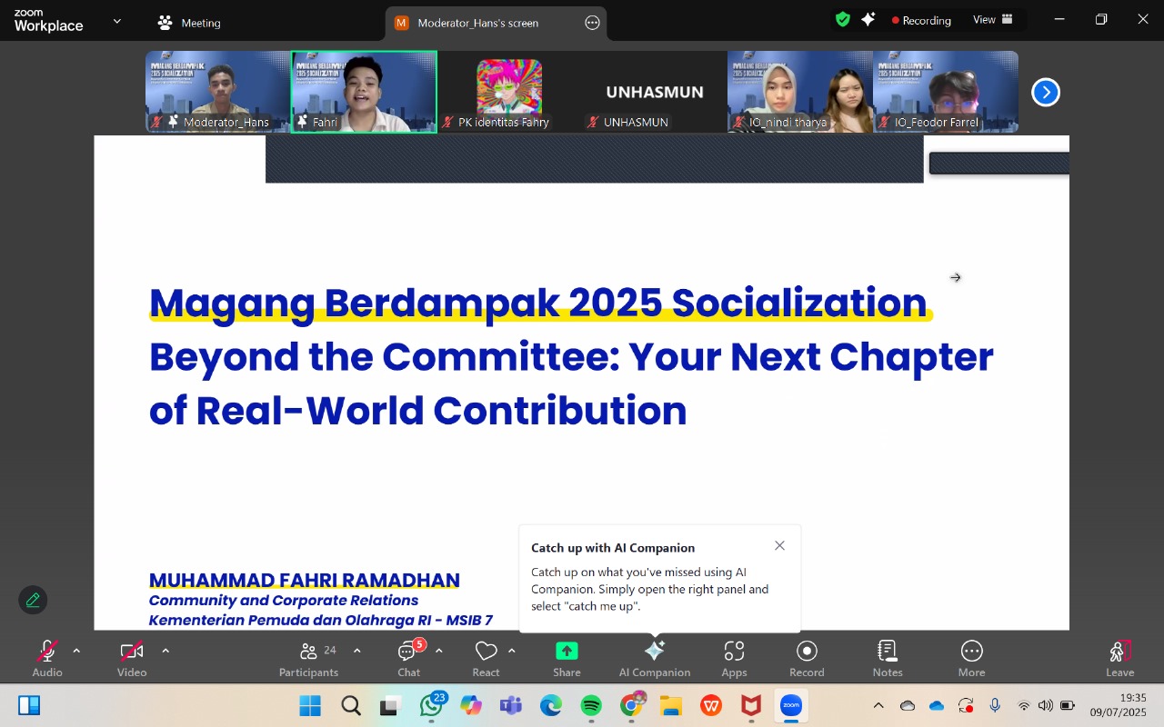 Hadir sebagai pemateri Muhammad Fahri Ramadhan, Mahasiswa Hubungan Internasional Fakultas Ilmu Sosial dan Ilmu Politik (FISIP) sekaligus alumni Magang dan Studi Independen Bersertifikat (MSIB) batch 7. Dalam sosialisasi tersebut, Fahri menyoroti beberapa hal yang sangat perlu diperhatikan sebagai seorang pelamar program Magang Berdampak.