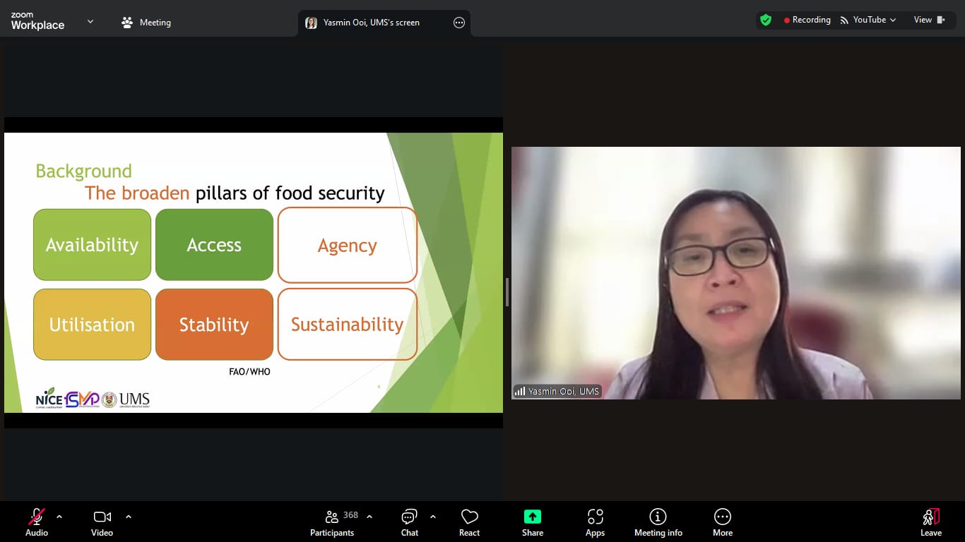 Webinar tersebut diadakan sebagai bagian dari rangkaian The 3rd International Conference on Nutrition and Public Health (ICNPH) 2025. Hadir sebagai narasumber, Dosen Senior Fakultas Sains Makanan dan Nutrisi Universitas Malaysia Sabah (UMS), Dr Yasmin Ooi Beng Hou membahas peran keagenan dan keberlanjutan dalam mewujudkan ketahanan pangan.