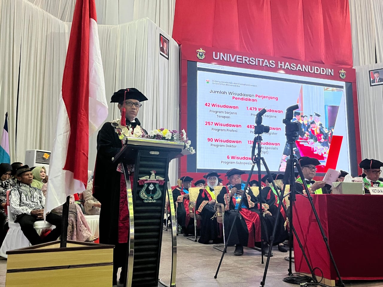 Wakil Rektor Bidang Akademik dan Kemahasiswaan (WR 1) Universitas Hasanuddin (Unhas), Prof drg Muhammad Ruslin MKes PhD Sp BM(K), menyampaikan orasi dalam Wisuda Program Sarjana, Diploma, Magister, Doktor, Profesi, dan Spesialis periode September Tahun Akademik 2024/2025. Kegiatan berlangsung di Baruga AP Pettarani Unhas dan disiarkan langsung melalui kanal YouTube Unhas, Selasa (02/09).